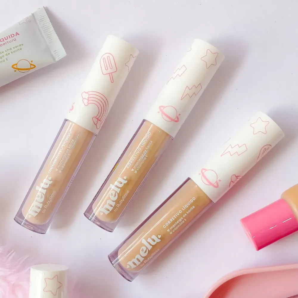 O Corretivo líquido da Melu possui cobertura leve, corrige as imperfeições da pele, além de olheiras, marcas de expressão, espinhas e cicatrizes, deixando um aspecto leve e natural.